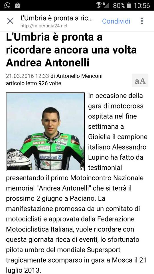 Moto Dolmen 2015 La manifestazione si svolgera' in ricordo di Andrea Antonelli, partecipera' Arnaldo Antonelli papa' del pilota. Sara' presente il mezzo e lo staff della "Clinica Mobile" che segue tutte le gare motociclistiche a servizio dei piloti. Ospiti della manifestazione saranno i piloti GP Andrea Iannone e Danilo Petrucci.